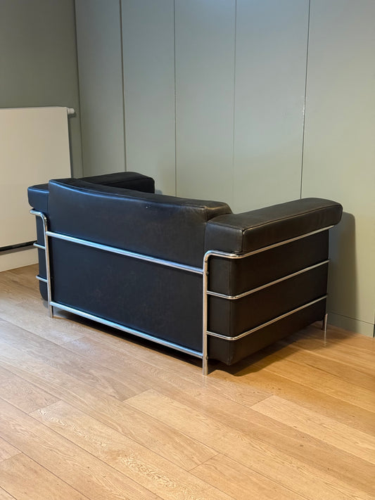 Corbusier Style 2-Seat Sofa Black Leather & Chrome