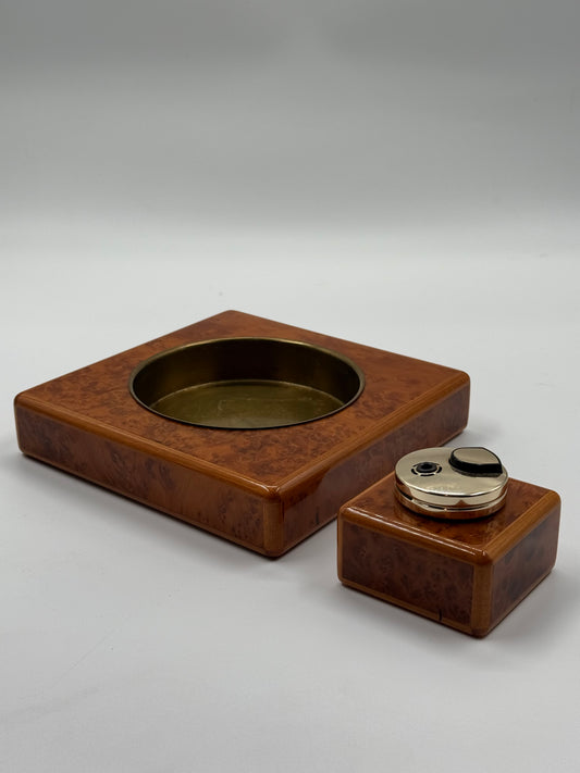 Burlwood style Ashtray & Lighter Set Vintage Brass Detail