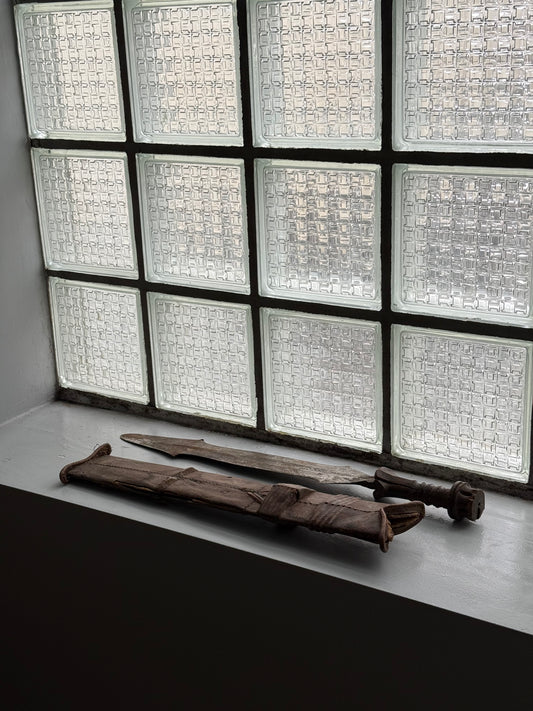 19th-Century Central African Forged Iron Sword with Leather Scabbard