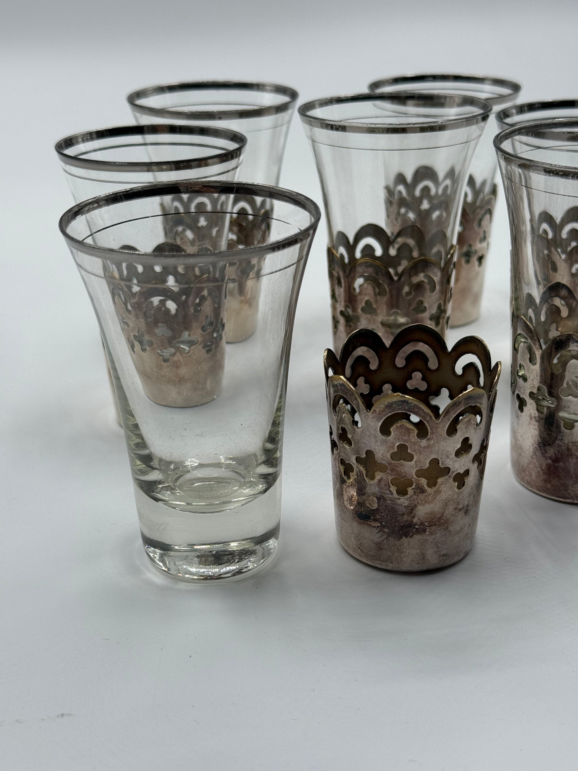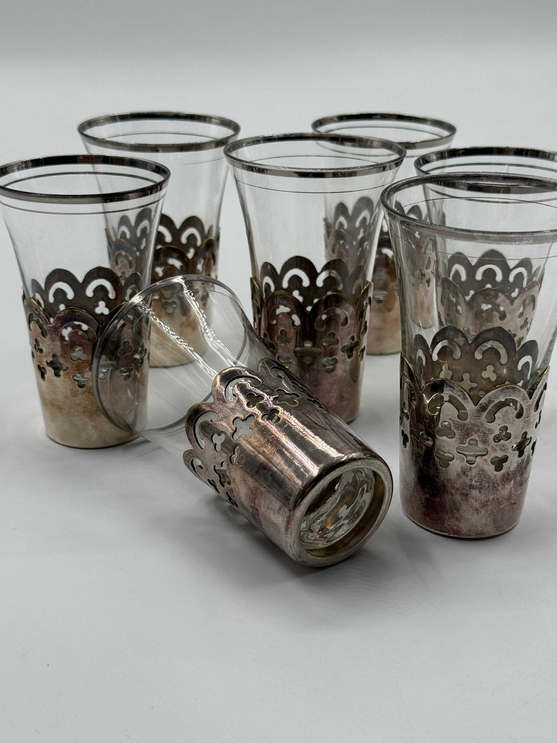 Set of 7 Vintage Moroccan Tea Glasses with Metal Holders