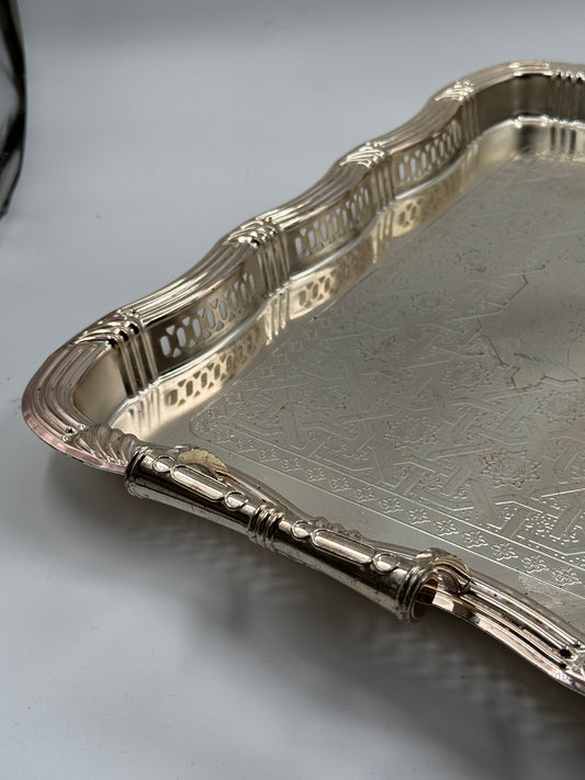 Vintage Engraved Silver-Plated Serving Tray with Ornate Handles