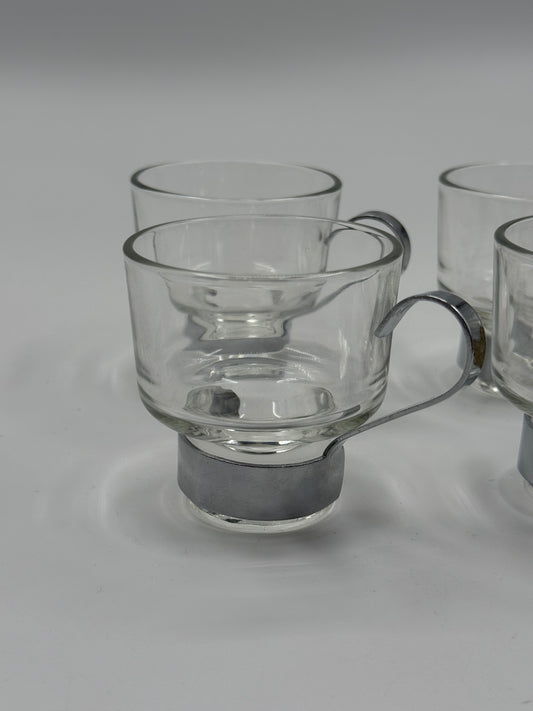 Set of 4 Modernist Glass Cups with Brushed Steel Holders