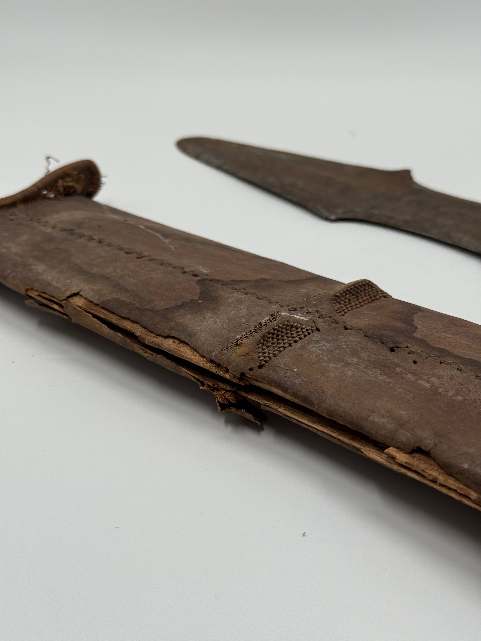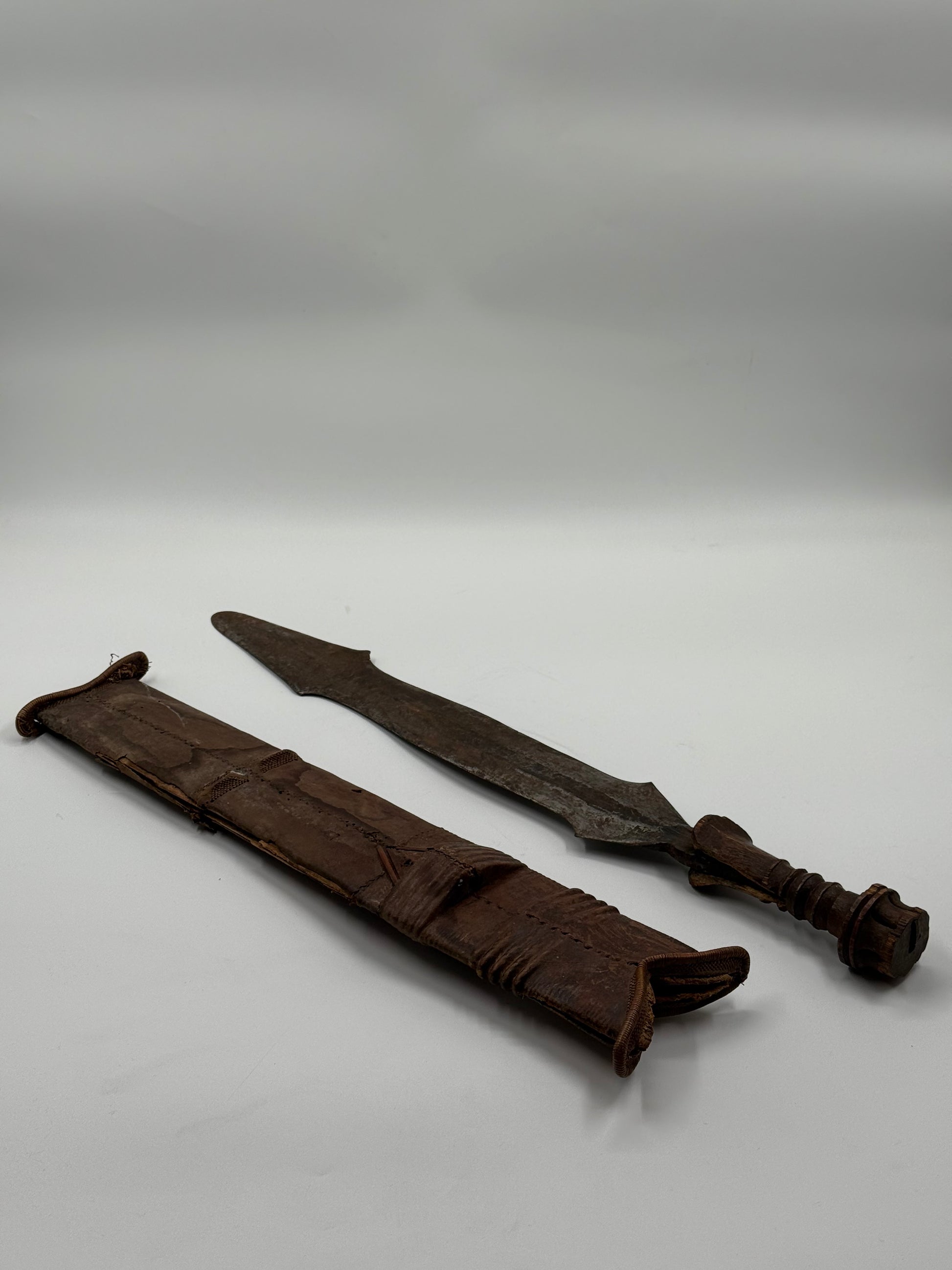 19th-Century Central African Forged Iron Sword with Leather Scabbard
