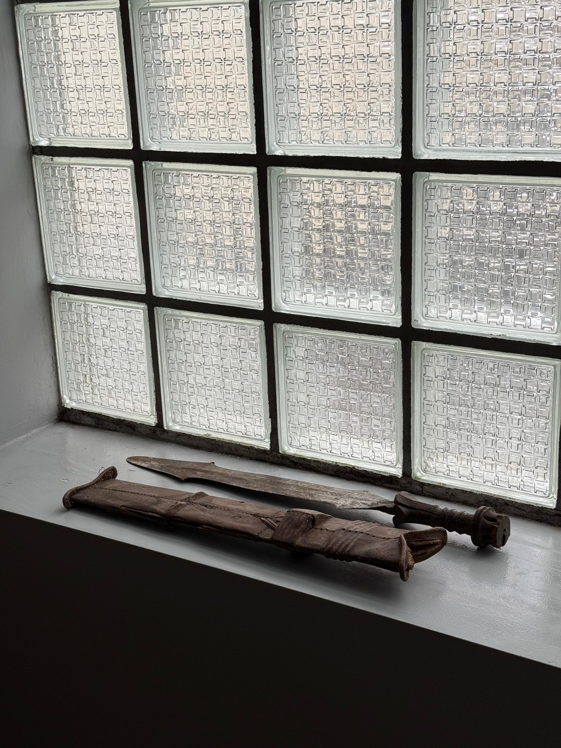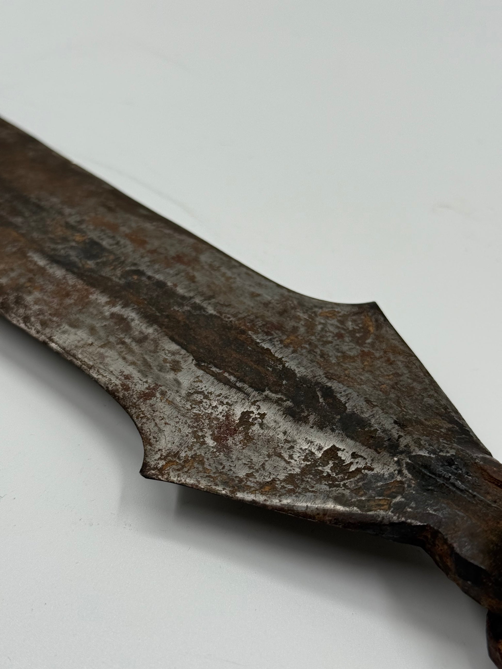 rare and compelling artifact from Central Africa, this forged-iron sword carries the raw presence of an object shaped entirely by hand and time. Its sculptural blade wide, tapered, and marked by deep, organic patination shows the irregularities and hammering lines characteristic of traditional blacksmithing in the 19th century.