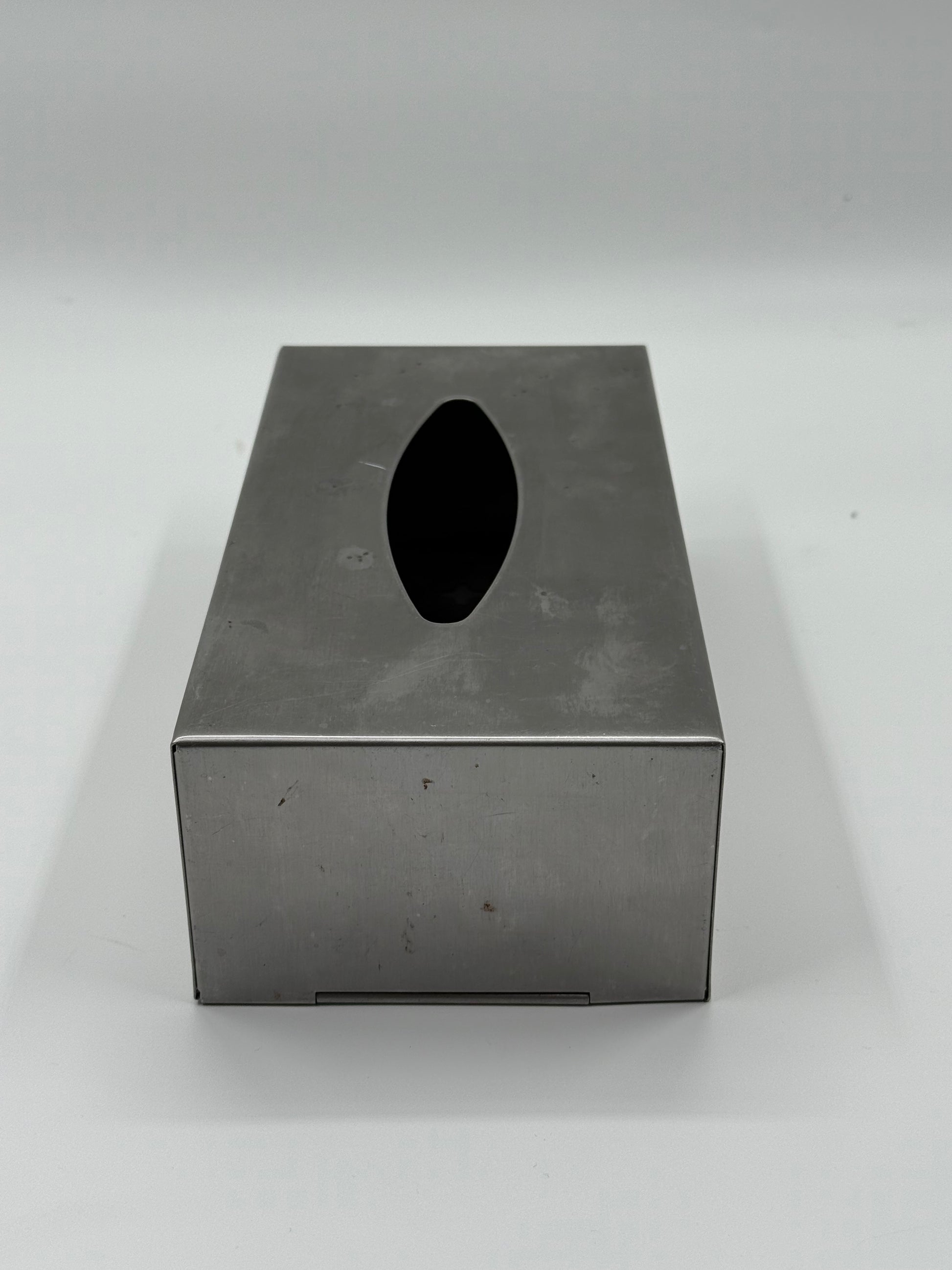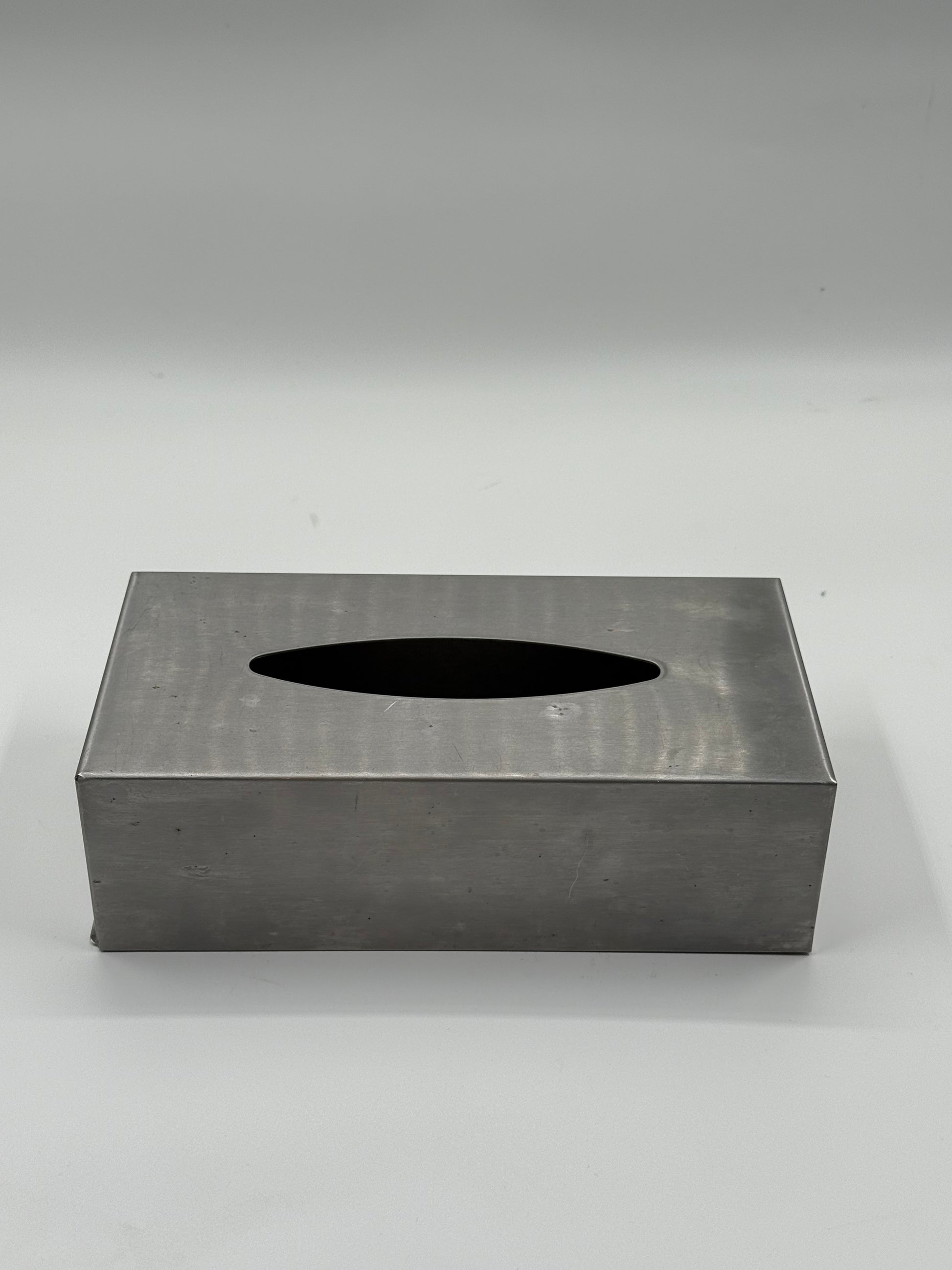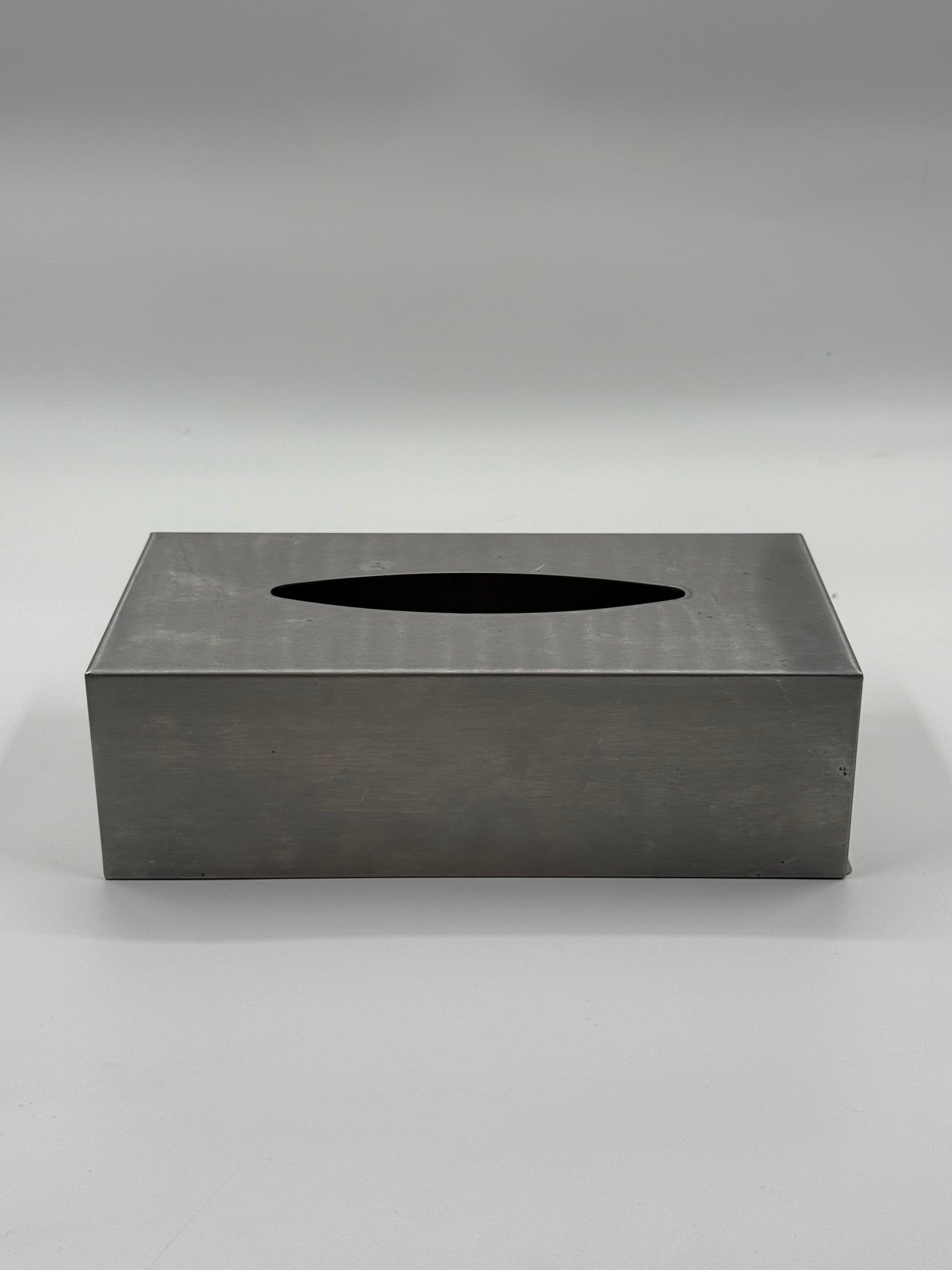 A minimalist tissue box cover in brushed steel, designed as a clean rectangular block with soft industrial character.