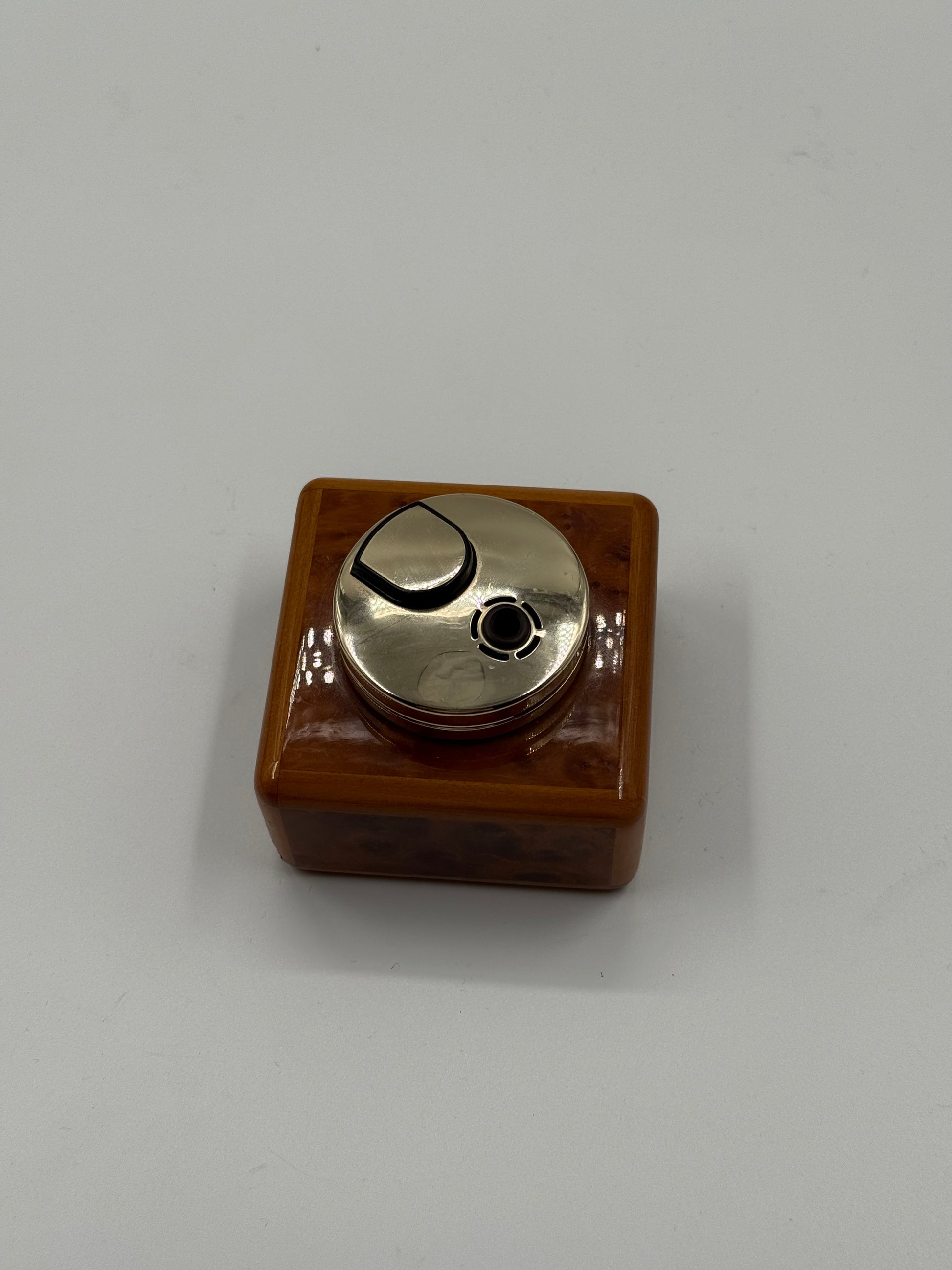 A refined ashtray and lighter set in warm burlwood tones, accented with a brass insert and a polished metal lighter top.