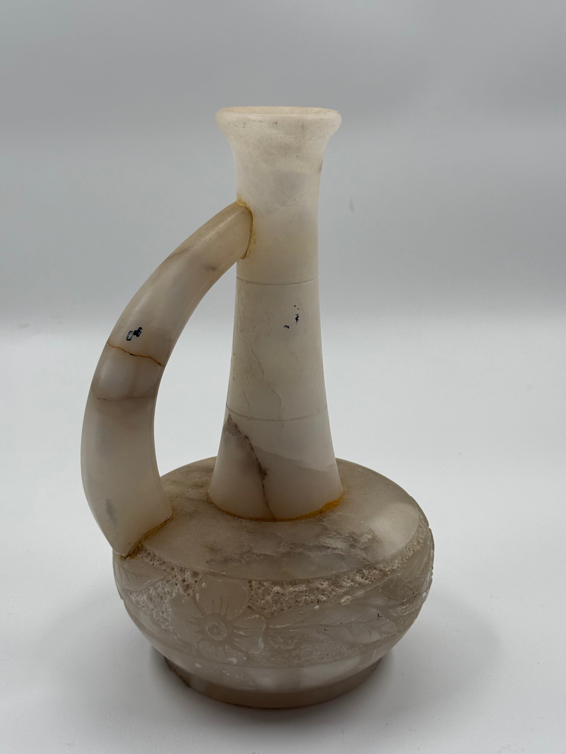 A sculptural decorative pitcher carved from natural green and cream onyx stone.