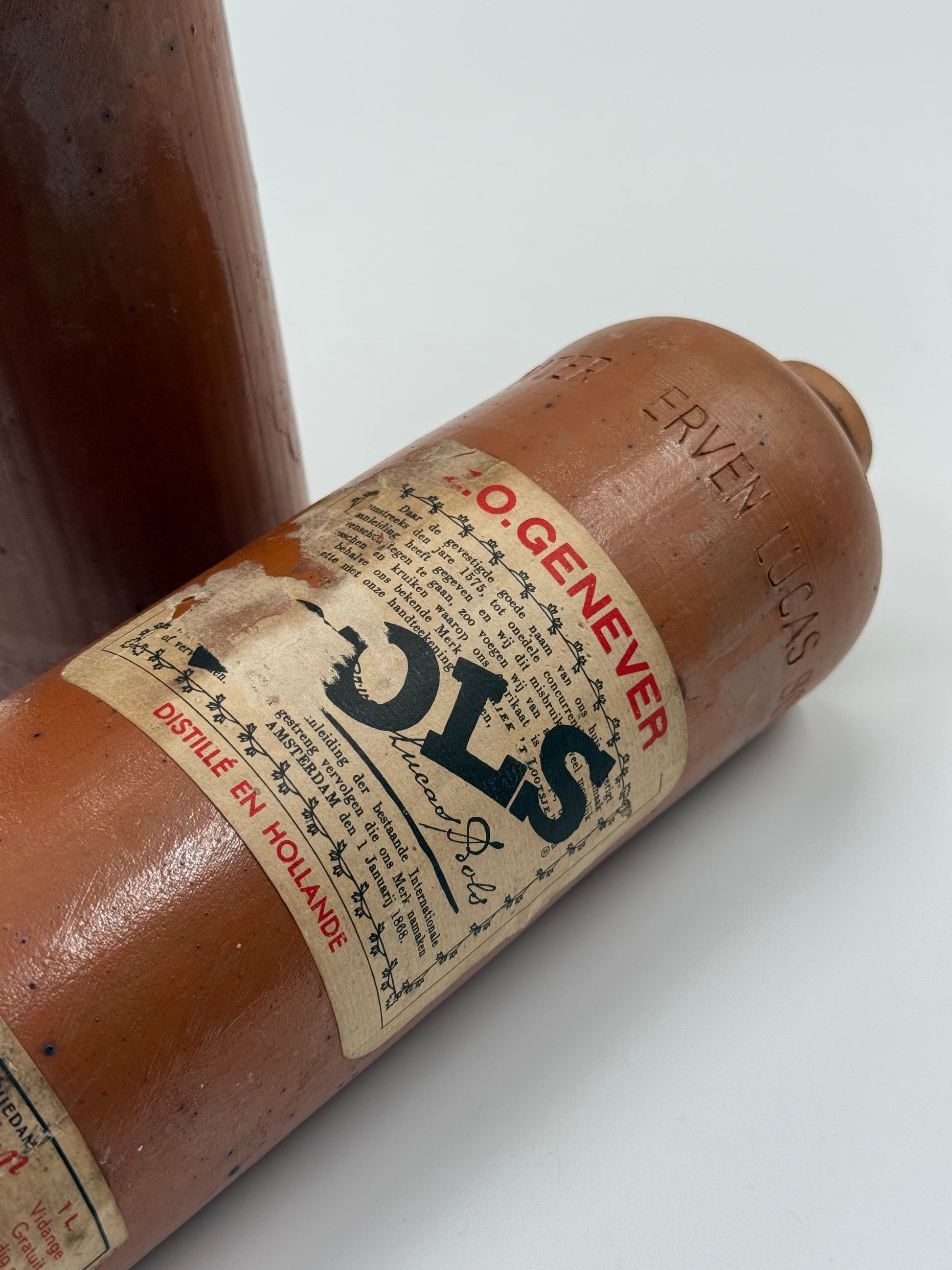 A rare pair of original Dutch Genever bottles, crafted in traditional salt-glazed stoneware and stamped with their historical origins: Amsterdam and Lucas Bols, one of the world’s oldest distilleries.