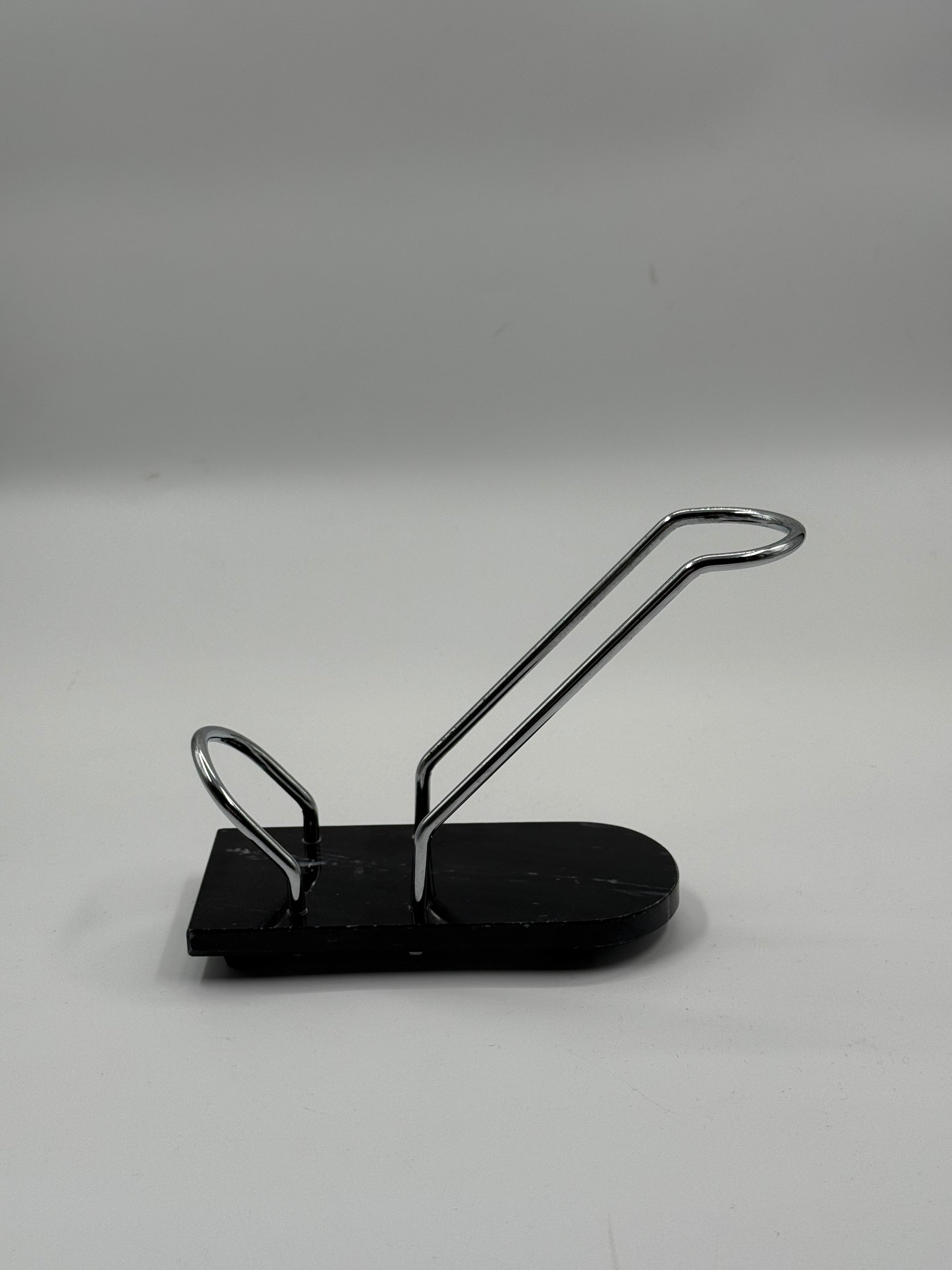A sculptural post-modern wine bottle holder featuring a solid black marble base and a polished chromed steel structure.