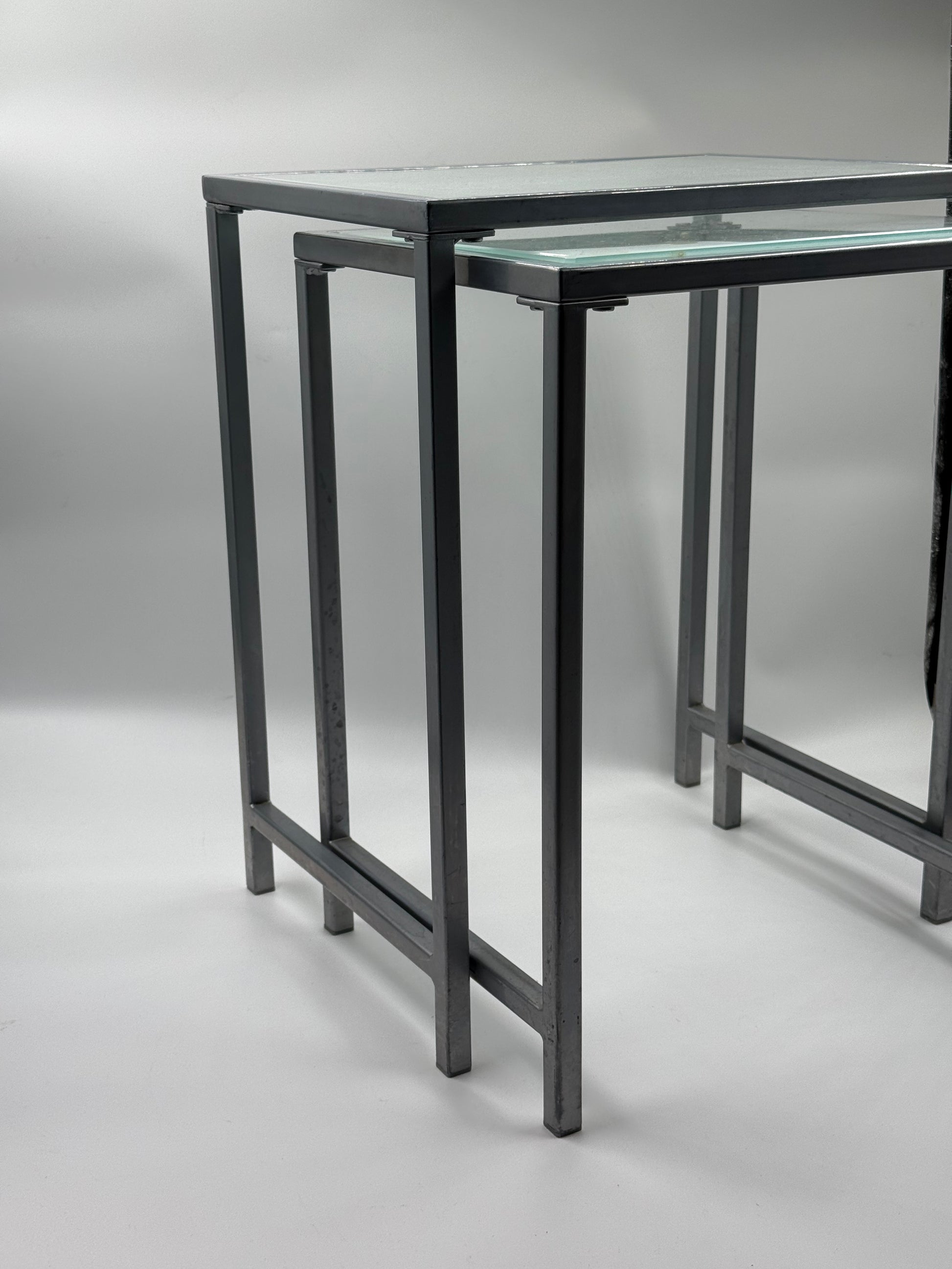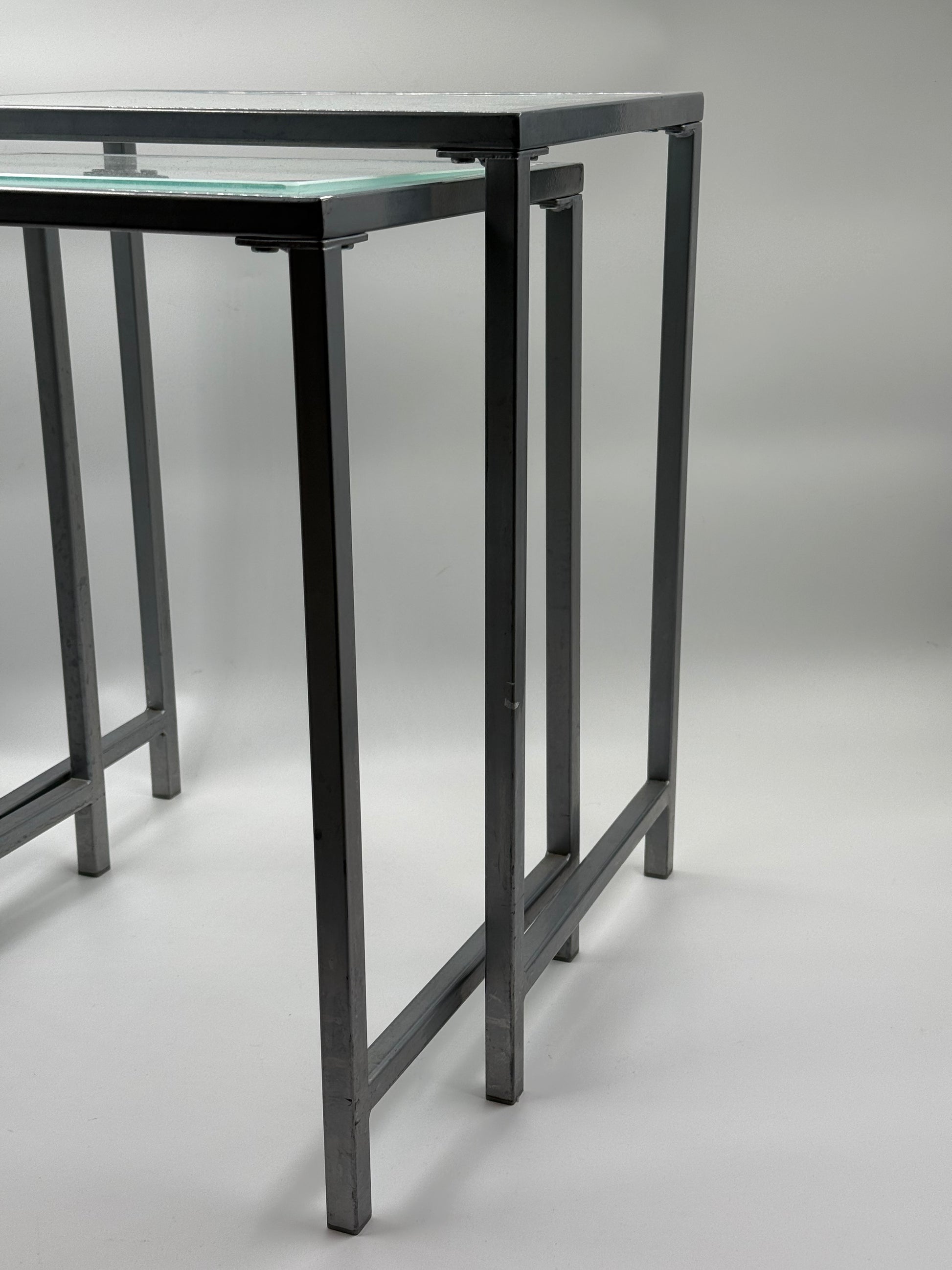 A set of two nesting tables combining glass tops with a clean industrial steel frame.